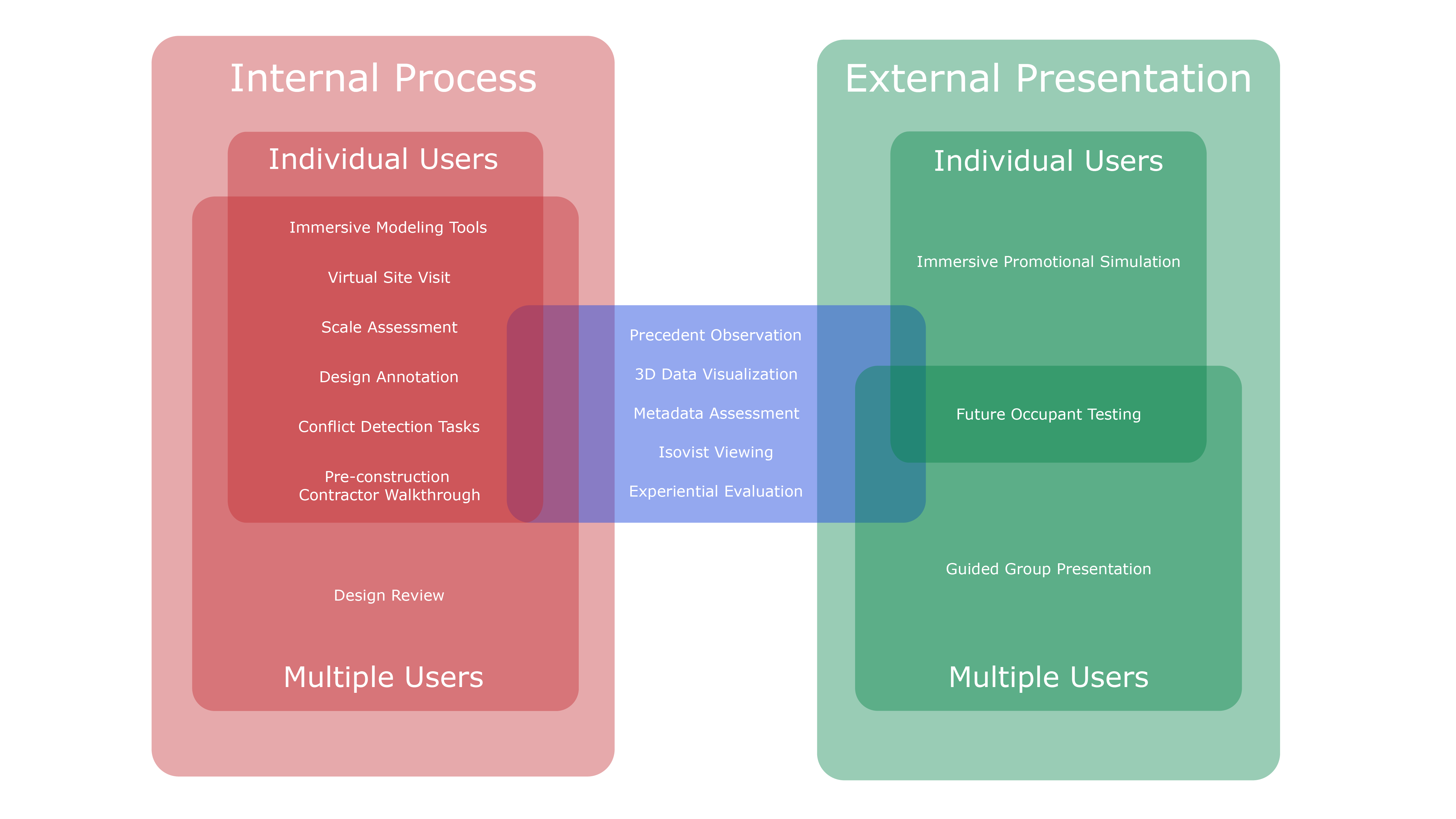 1) Exploration: Ran qualitative interviews and focus groups to gather design requirements, outlined VR usage scenarios for architectural design process.