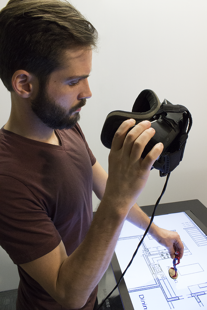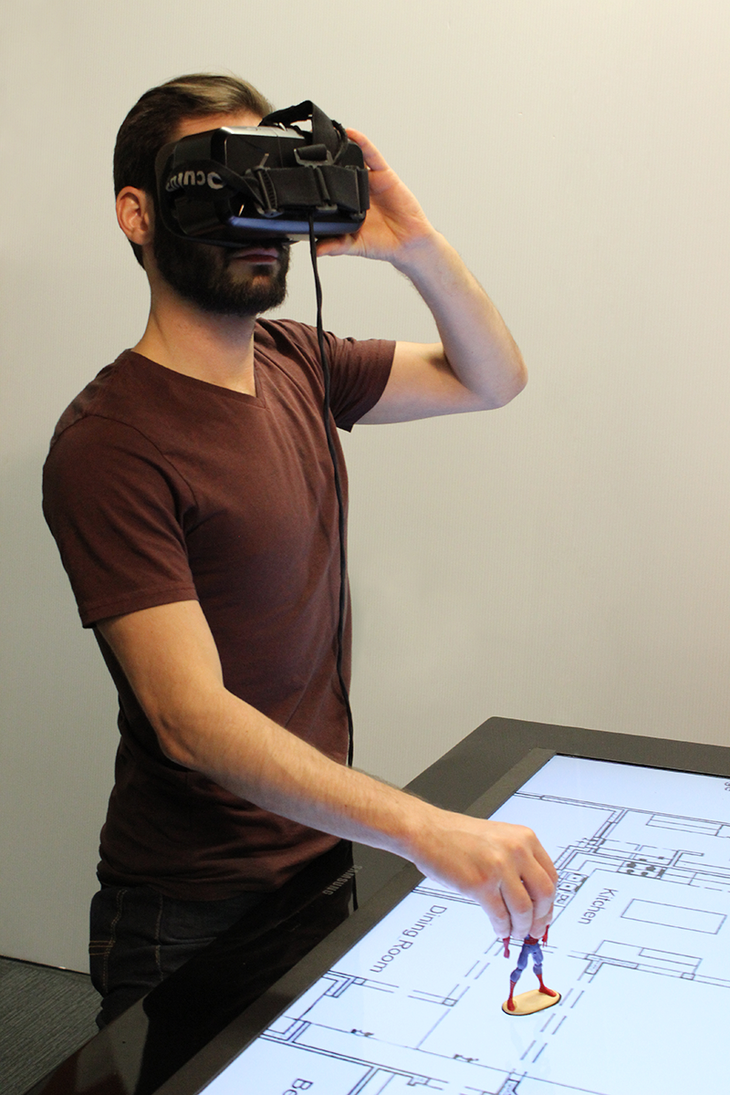 Imagine having a simple and straightforward way of knowing where you are in a building plan, while still being able to immerse yourself quickly and easily within the 3D environment. Using a Microsoft Surface Tabletop interface and the Oculus Rift DK2, we built a prototype capable of controlling the orientation and position of the user in a virtual environment via manipulation of a tangible avatar positioned on the display.